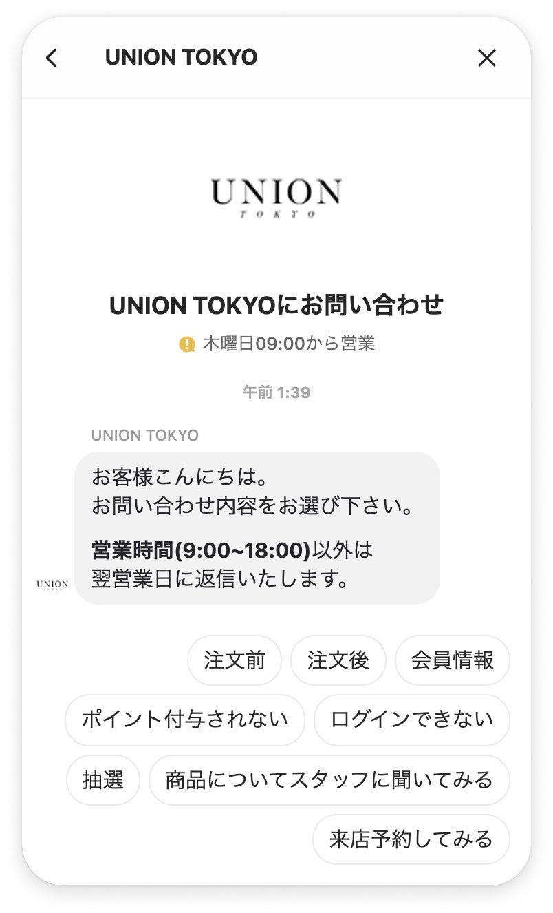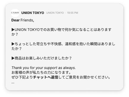 UNION TOKYOはお客様に商品を買う前も買った後も感動してもらえることを大切にしています。そのためには実店舗のみならずオンラインでの顧客体験が鍵になります。チャネルトークを導入する前はメールのお問い合わせも多く捌き切れていなかったことからお客様の体験に課題がありました。しかしBotであればよくある質問は自動化させることで、現場の工数を削減し、本来向きあるべきお問合せに時間を割くことでより顧客体験を向上できることからチャネルトークを導入いただきました。