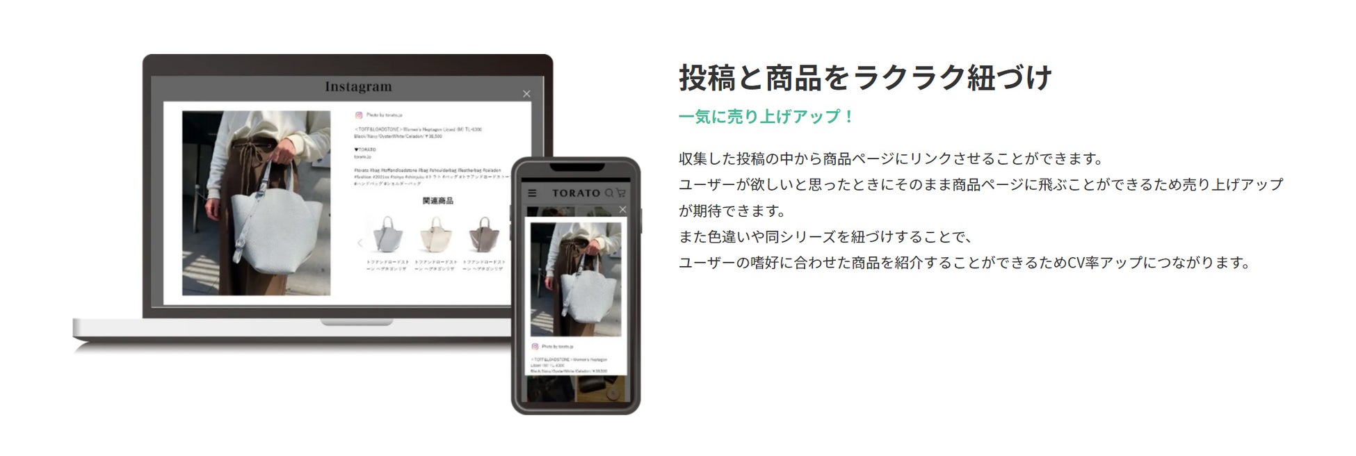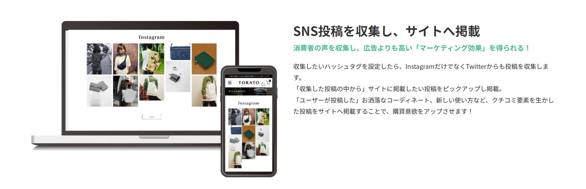 Instagram、Twitterのユーザー投稿を指定のハッシュタグで収集して、自社のサイトに表示する事ができ、その他に公開の承認機能や商品との紐づけによるCVアップの機能、効果の分析機能など必用な機能を揃えています。