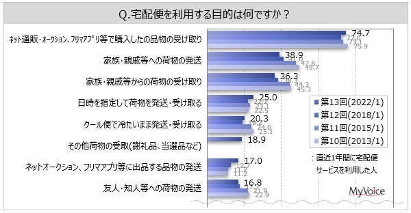 直近1年間に宅配便サービスを利用した人の利用目的は(複数回答)、「ネット通販・オークション、フリマアプリ等で購入したの品物の受け取り」が74.7%、「家族・親戚等への荷物の発送」「家族・親戚等からの荷物の受け取り」が各4割弱、「日時を指定して荷物を発送・受け取る」「クール便で冷たいまま発送・受け取る」が各20%台です。過去調査と比べて、「家族・親戚等への荷物の発送」「家族・親戚等からの荷物の受け取り」「代金引換で受け取る」が減少しています。