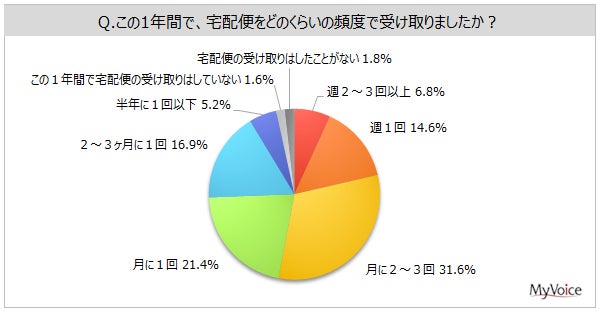 直近1年間に宅配便を受け取った頻度は、「月に2~3回」「月に1回」がボリュームゾーンです。月1回以上受け取った人は、7割強となっています。