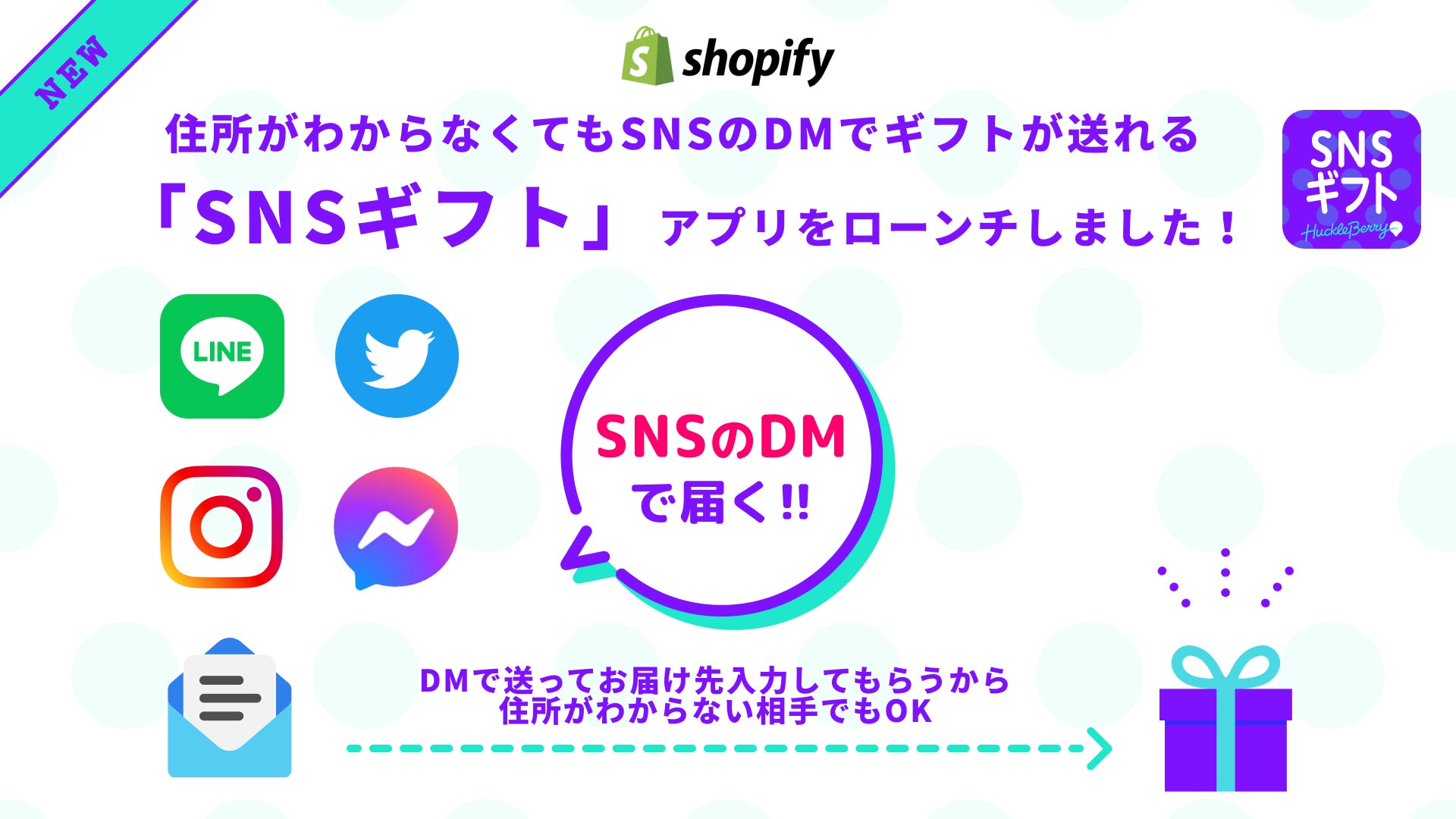 株式会社ハックルベリー(東京都渋谷区、代表取締役社長:安藤 祐輔、以下「ハックルベリー」)は、住所を知らなくても受け取りURLをDMで送るだけで贈り物を届けられるShopifyアプリ「SNSギフト」をリリースいたしました。