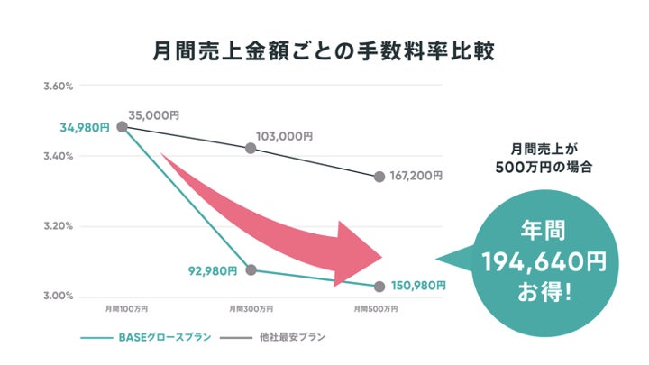 既に「BASE」をご利用されている加盟店の場合は、ショップの売上規模が月商17万円を超えると従来の料金プランよりも手数料を抑えられるため、その分の費用を商品の開発や販促、仕入れなどに還元いただくことで、ショップのさらなる成長が見込めます。