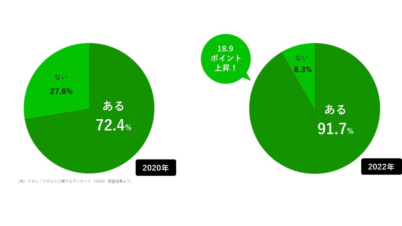 インターネット上で1年以内にクチコミを目にしたことのある人は、9割を超すという結果に。イオレが2020年に実施した同アンケートの結果(上図左)と比較すると、18.9ポイントも上昇しています。インターネット上でクチコミに触れる機会が大きく増加していることが読み取れます。