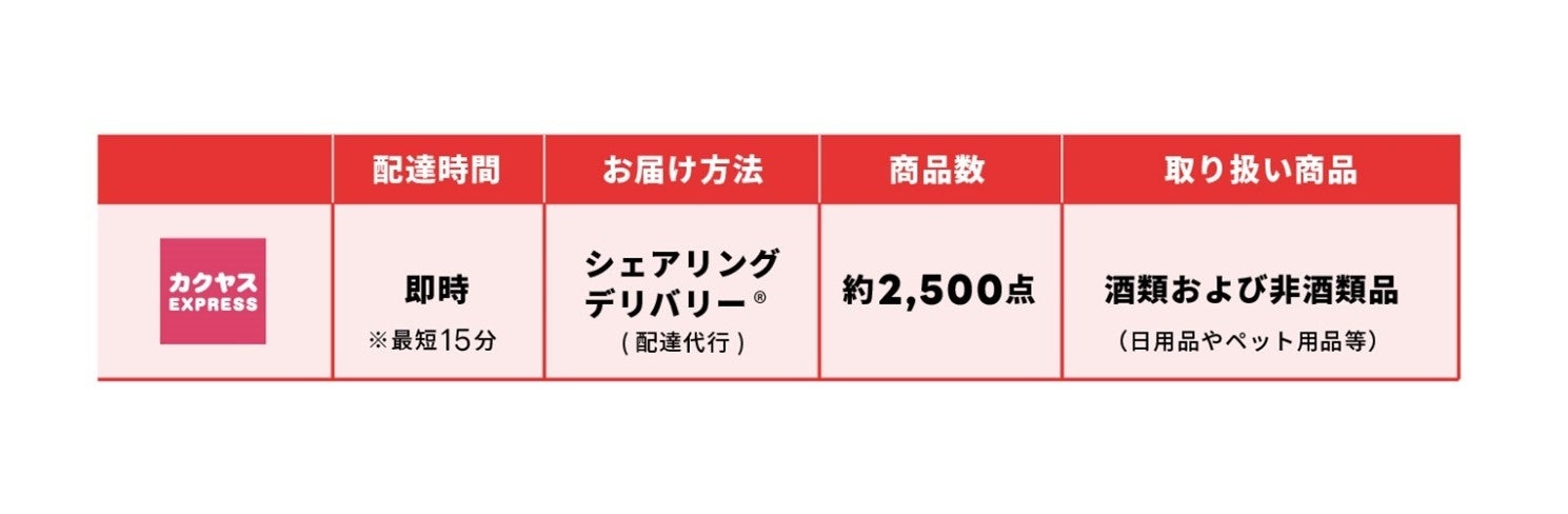 「カクヤス」は従来より、「なんでも酒やカクヤス」として『出前館』に出店しており、自社配達にてお届けを行っております。このたびの新ブランド「カクヤス EXPRESS」では、『出前館』のシェアリングデリバリー®を導入し、最短15分※1でお客さまへさまざまな商品をお届けいたします。さらに取り扱い商品は、非酒類品が増えることで約2,500種類となり幅広いラインナップへと拡充いたします。