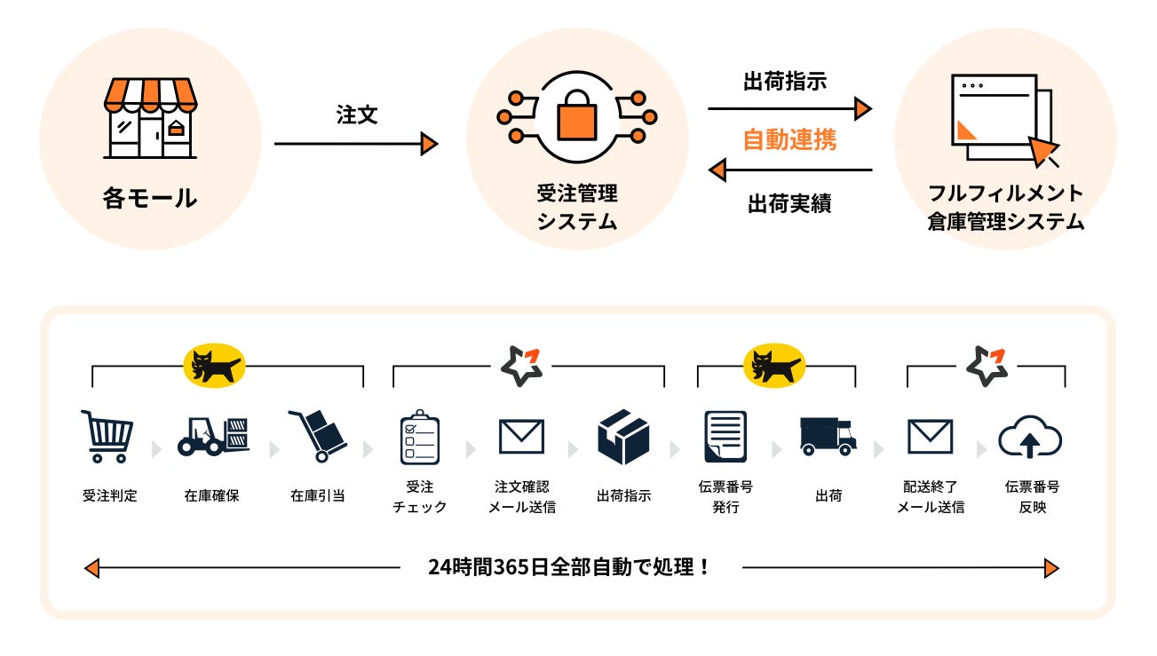 今回、「TEMPOSTAR」が「ヤマトフルフィルメントサービス」とAPI連携することにより、「Yahoo!ショッピング」「PayPayモール」の出荷のみならず、「TEMPOSTAR」に取り込まれている注文データ※1を、「ヤマトフルフィルメントサービス」出荷データに自動連係されることで梱包・配送サービスから365日出荷対応することが実現できます。