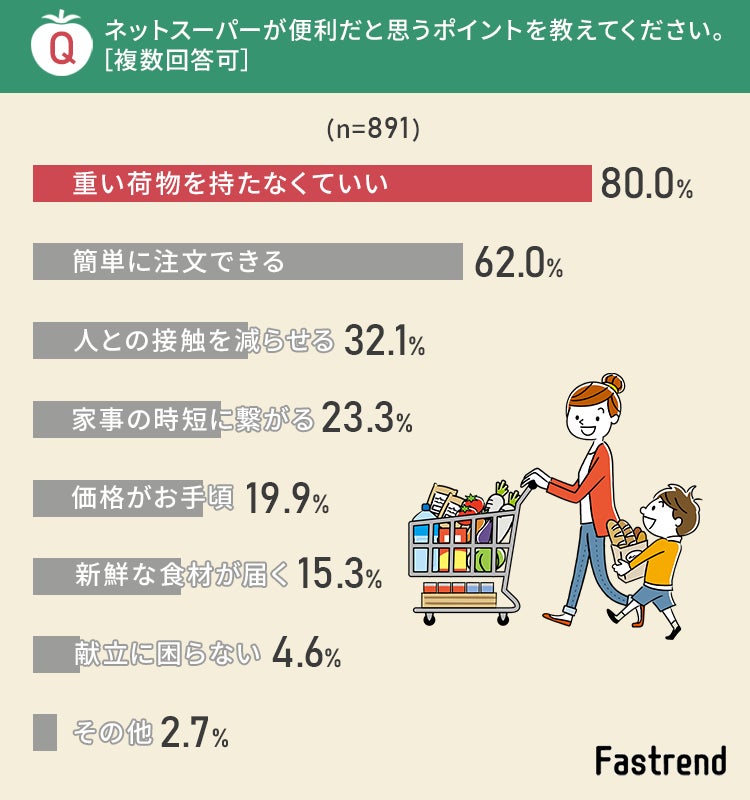 他にも「簡単に注文できる」や「人との接触を減らせる」が、ネットスーパーのおすすめポイントとして上位にランクインしていました。