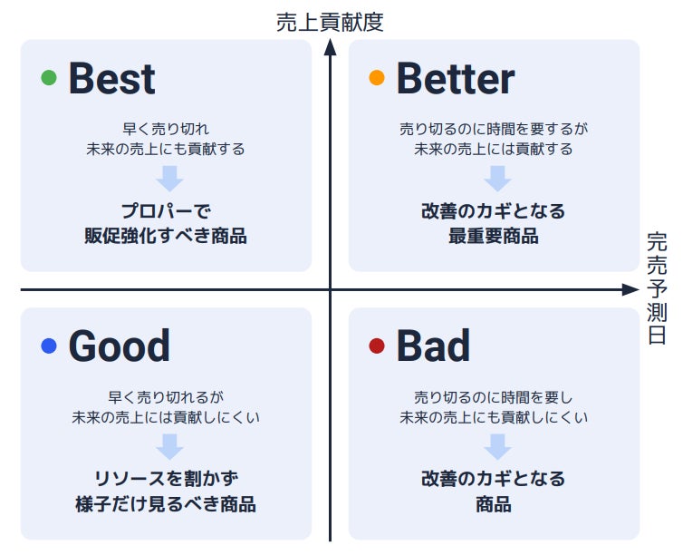 FULL KAITENは従来より、全ての在庫をSKUごとに在庫リスク(完売予測日)と売上・利益に対する貢献度の2軸で評価し可視化する「クオリティ分析」機能を提供してきました(下図参照)。