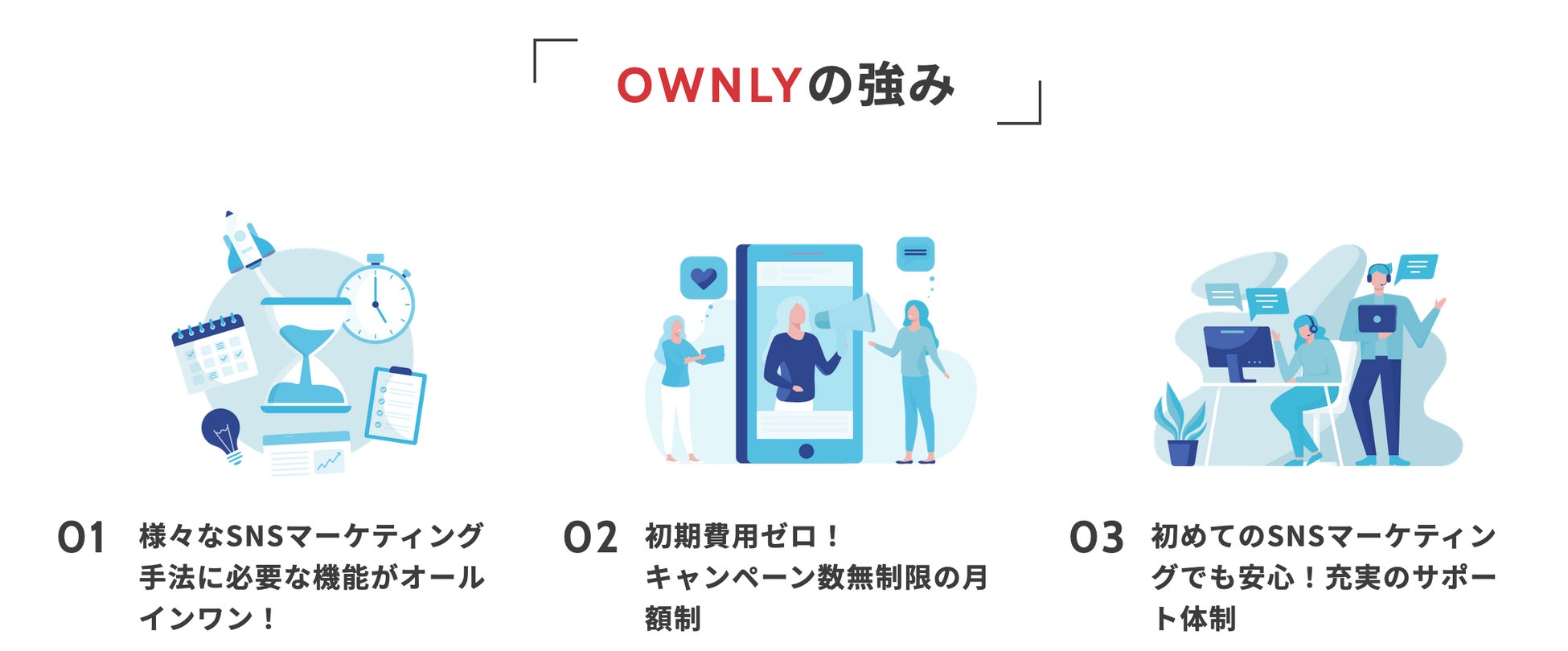 OWNLY(オウンリー)は、SNSのマーケティングを一元管理できるサブスクリプション型のマーケティングプラットフォームです。TwitterやInstagramなどのSNSキャンペーンで集客し、ユーザーの声(UGC)を活用したマーケティング&コミュニケーションに貢献。様々なSNSマーケティング手法を、これひとつで実現できます。