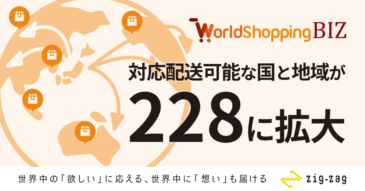 ウェブインバウンド・越境EC支援を行う株式会社ジグザグ(本社:東京都渋谷区、代表取締役:仲里一義)は、運営する越境EC対応サービス「WorldShopping BIZ(ワールドショッピングビズ)」において、配送可能エリアを228の国と地域に拡大いたしました。