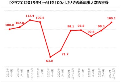 アパレル・ファッション業界の2021年10~12月期の転職求人倍率は、1.76倍でした(表①参照)。10職種中8職種が2.0倍を上回り、コロナ流行以前の“売り手市場”へと戻りつつあります。新規求人数も同様に右肩上がりで推移。2021年10~12月期の新規求人数は、コロナ流行前の2019年4~6月期と比較し109.1%で、第1回緊急事態宣言を受け企業が一斉に採用活動を一時中断した2020年4~6月期以降、初めて100%を上回りました(グラフ①参照)。また、2年前の同時期である2019年10~12月期の新規求人数と比較すると97.0%。前年同期比は111.0%でした。