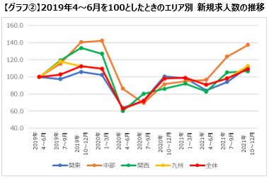 中四国エリアの求人数は2倍以上に増加。元々、他エリアと比較して求人が少ないエリアではありますが、2021年10~12月期は広島・岡山県でラグジュアリーブランドの採用が復活。求人数を牽引しました。これは、ラグジュアリーブランドの人気拡大を受け、来店数が増えてることから、接客力を強化することで、ブランドのファンを増やしリピーターに繋げたいと考える企業が多いためと言えます。