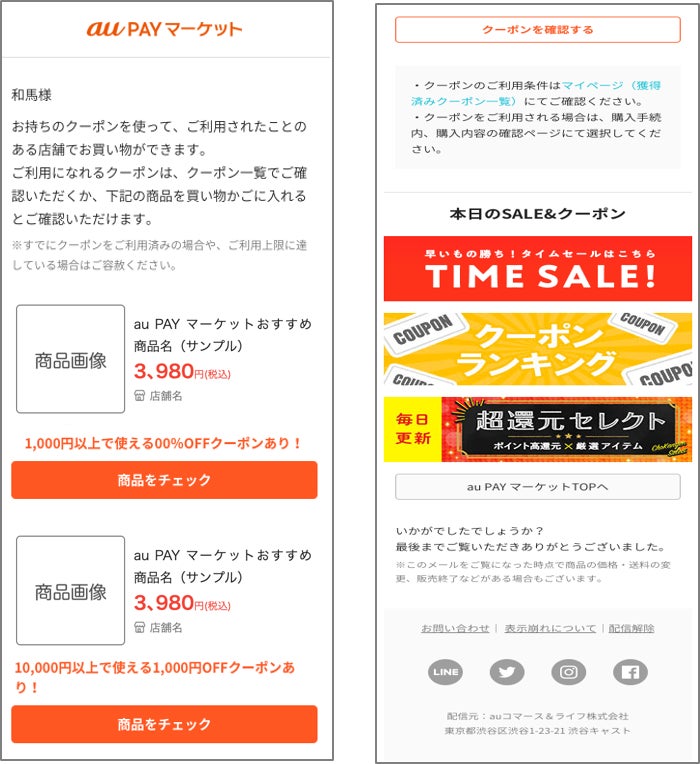 さらに、お客さまのサイト内閲覧履歴などのデータレコメンドを用いて配信内容をパーソナライズし、出店店舗さまはお客さまに対し効率よく継続的なお買い物の促進やご購入の機会をご提案することができます。また、au PAY マーケットをご利用のお客さまも、クーポンで利用可能な商品をいち早く知ることが可能となり、お得にお買い物いただけます。
