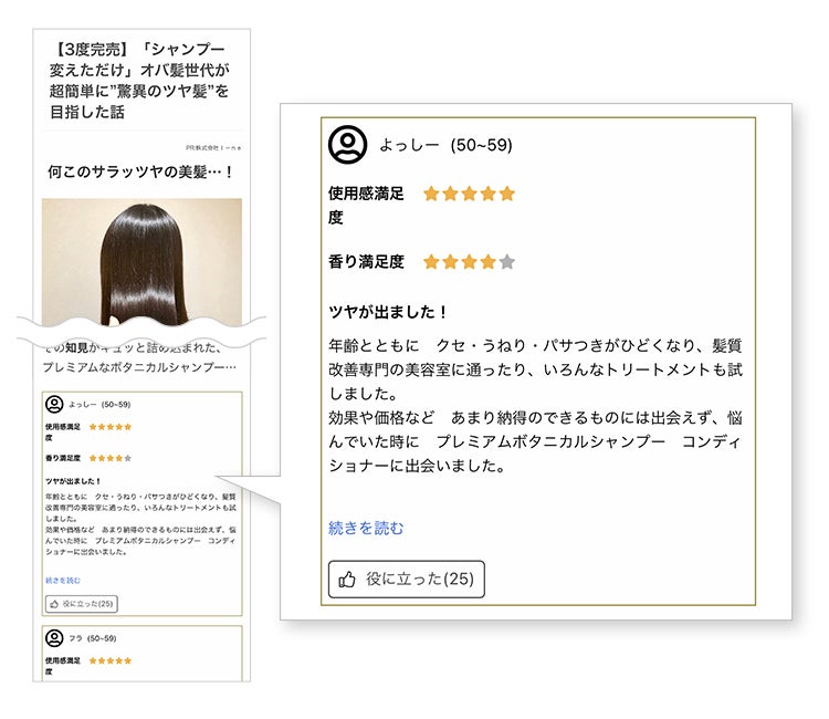 BOTANISTの新規顧客獲得向け記事LPに、「Letro レビュー(※2)」の仕組みを活用して、購入者によって投稿されたレビューの掲載を開始しました。商品購入者に対して自動的にレビュー投稿を促すメッセージが送信されることで、継続的に様々なレビューを生成することができるようになった結果、記事LP上に潜在的なニーズを喚起しうるようなレビューを掲載することが可能になりました。