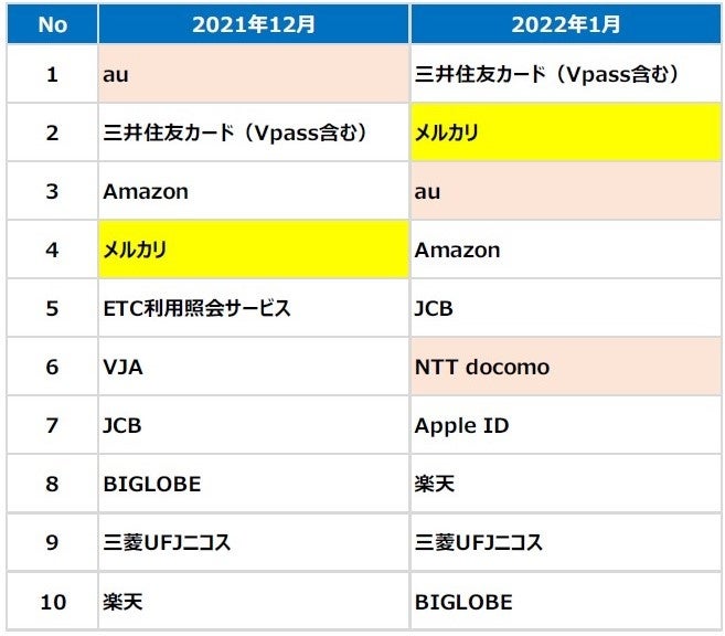 なお、詐欺ウォールで収集したフィッシング詐欺サイトで盗用されていたブランドの上位10位は以下の結果となり、急増しているメルカリが2位に入る結果となりました。
