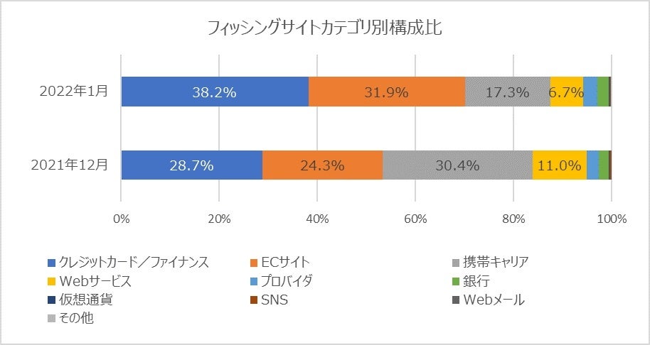 11月より増加傾向にあり、注意喚起をしていた前月1位のauがピークアウトした格好となり、通信キャリアではNTT docomoが6位に浮上してきています。インターネット詐欺リポート(2021年12月度)でも報告しておりますが、これまで通信キャリアをかたったフィッシング詐欺サイトは常に一定数確認されており、今後も注意が必要です。