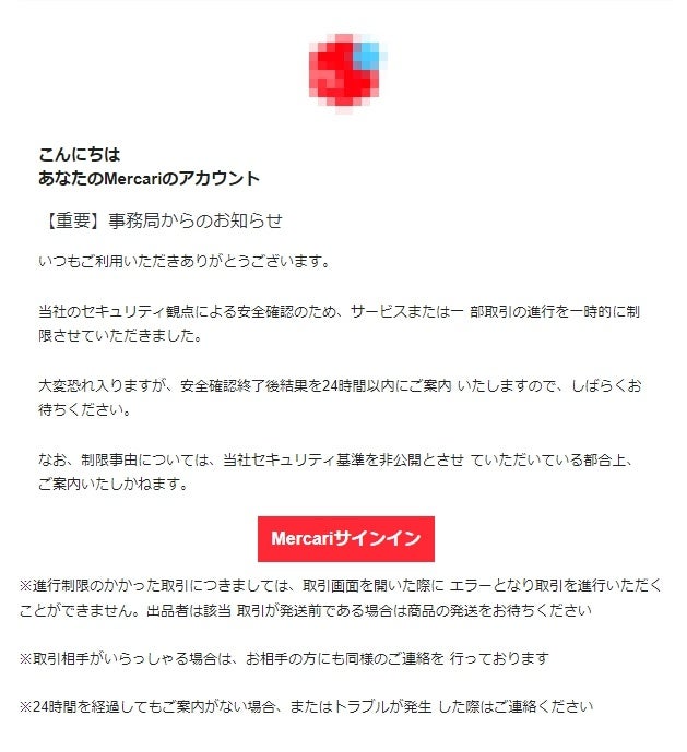 主な手口は、メルカリを装ってメールやSMSを送り、メルカリとそっくりな偽サイトに誘導しメールアドレスやパスワードを入力させようとするものです。メルカリのアカウントはスマホ決済サービス「メルペイ」と連携しているため、IDのメールアドレスやパスワードを入力してしまうと、アカウントを乗っ取られ、不正利用されるなどの危険もあるため、一層の注意が必要です。