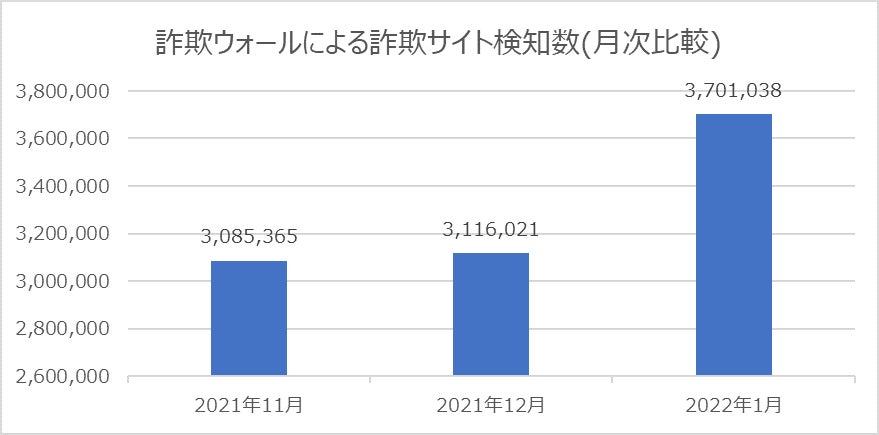 2022年1月に詐欺ウォールによる詐欺サイト検知数は3,701,038件となり、12月と比較すると585,017件増加する結果となりました※。