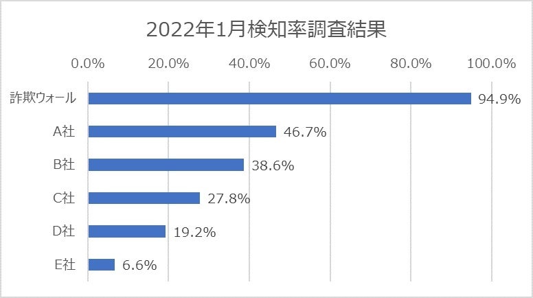 詐欺ウォールを開発・提供するBBソフトサービスでは、公的機関等との連携により収集した詐欺サイトURLを利用し、定期的に詐欺サイトの検知率調査を行っています。2022年1月の詐欺ウォールによる詐欺サイト検知率は94.9%と他社と比較し高い結果となりました。