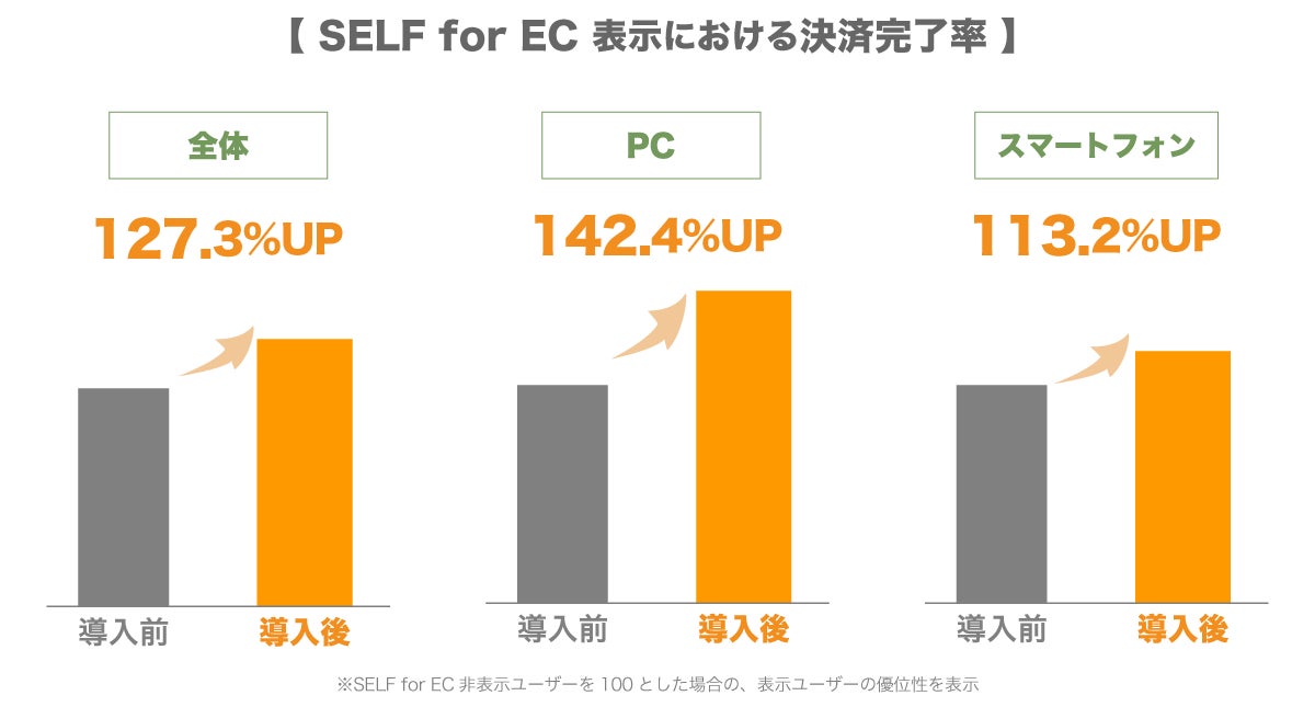 特にPCにおいては、決済完了率が142.38%となっております。SELF for ECを表示することで決済までの導線を効率化し、ユーザーにとってスムーズな購買行動を実現させるに至ったと考察しております。