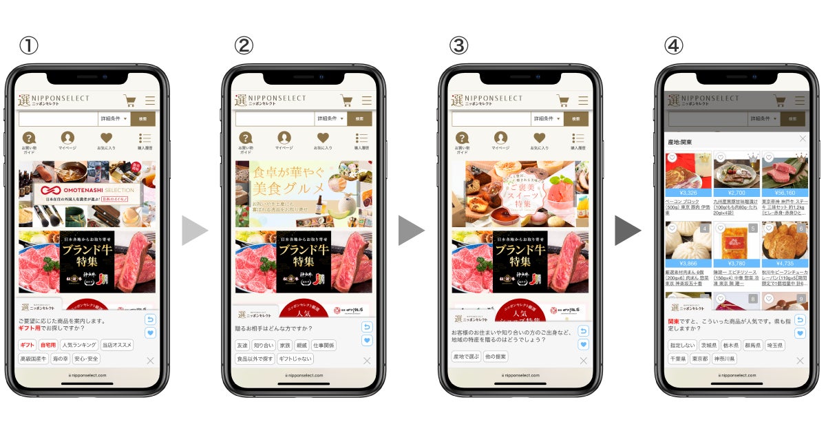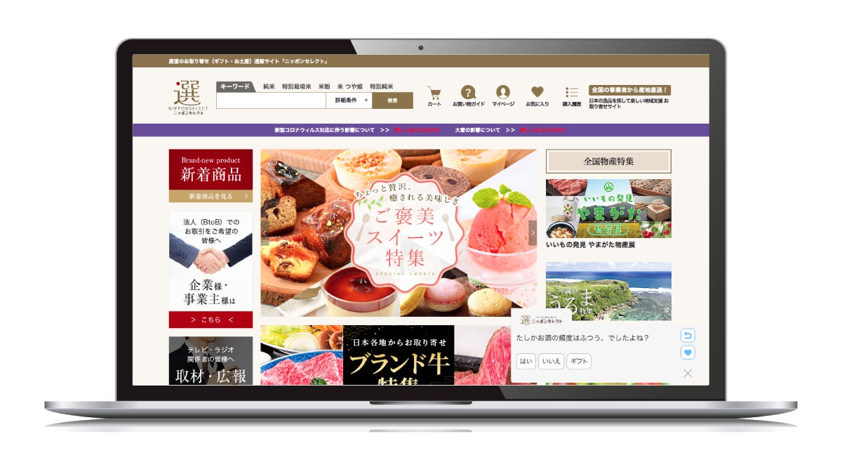 2020年10月より、日本の逸品を探して楽しい地域支援をコンセプトとした産直お取り寄せ通販サイト「ニッポンセレクト」にSELF for ECを導入いただき、サイト内の接客の効率化を図りました。結果を定量的に判断するため、以下の内容でABテストを実施し、SELF for ECが売上にどのような効果をもたらしたかを計測いたしました。