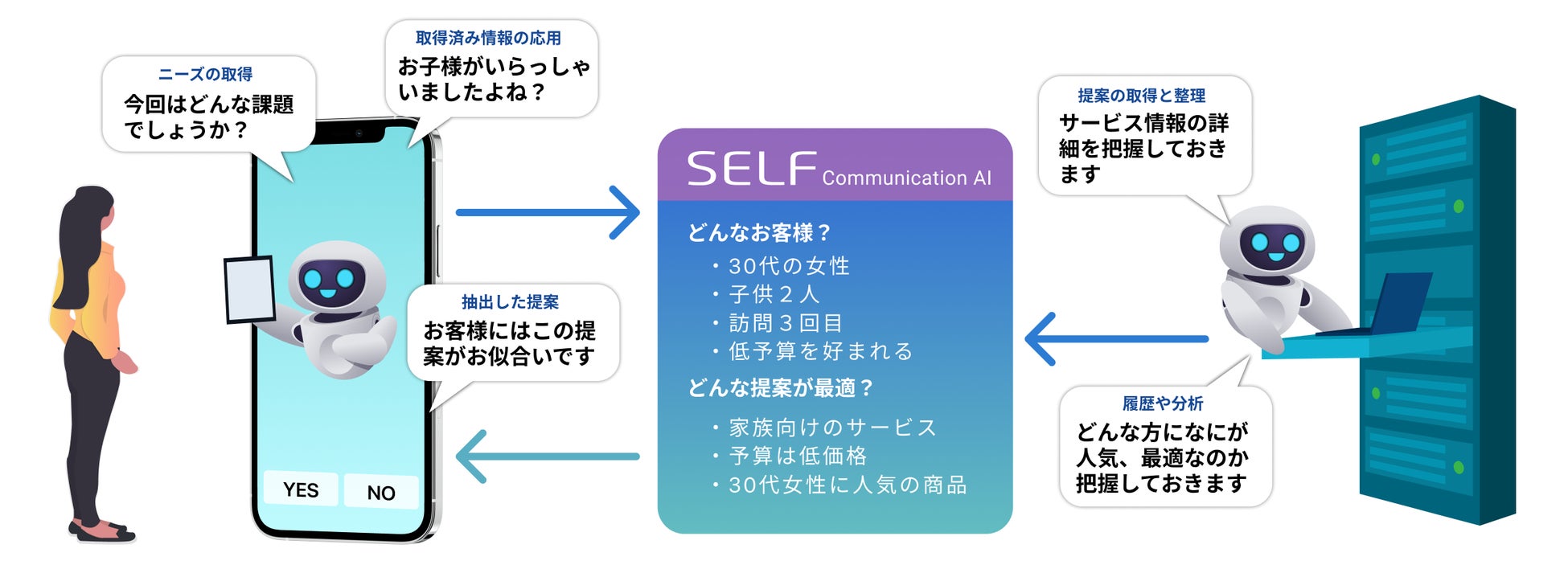 図のように、会話によりユーザーのニーズを把握し、商品提案を行ないます。