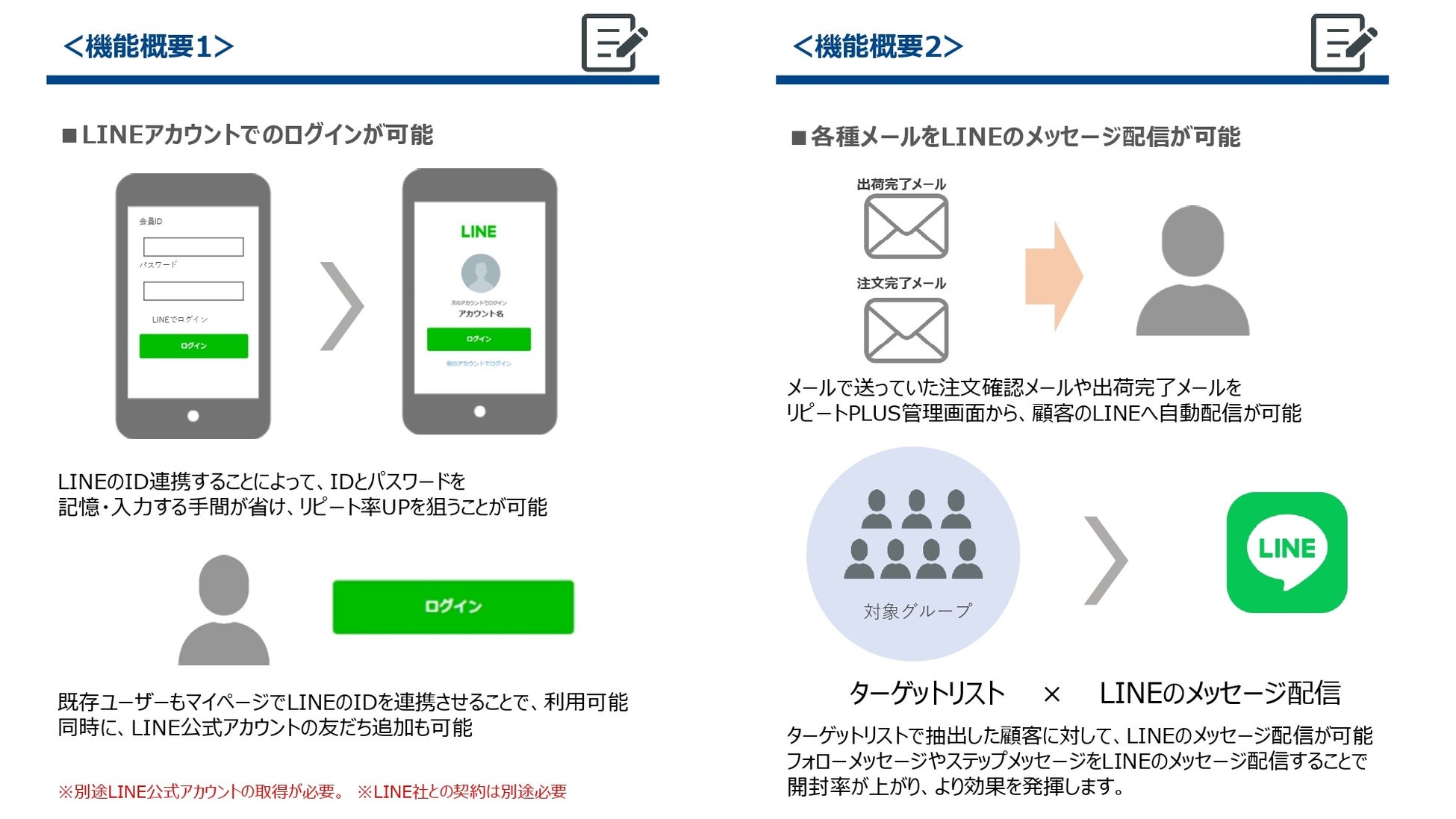 そしてこの度、「リピートPLUS/w2Commerce」とLINEのID連携したことで、注文完了メールや配送完了メールなどLINEのID連携済のユーザへLINE経由での一元管理が可能になりました。