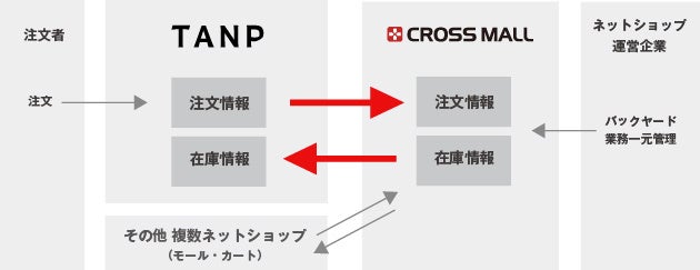 このたびの連携により、「TANP」に出店されている複数ネットショップ展開企業さまは、「CROSS MALL」が管理している注文情報を反映することで、随時更新されている在庫数を「TANP」の在庫数と共有することが可能となり、在庫を一元管理できます。また、売り残しリスクを軽減した商品の出品が可能となるため、業務効率化だけではなく、販売促進にもつなげることができます。