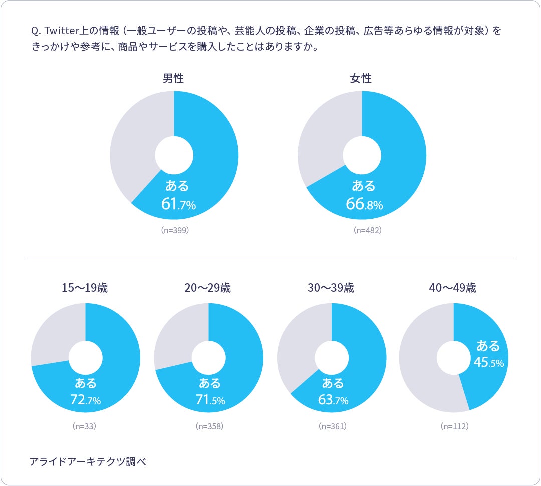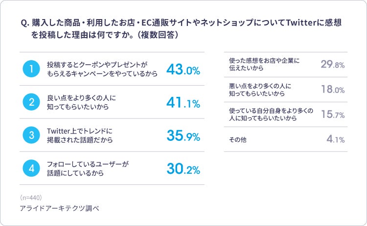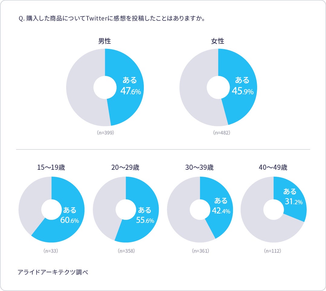 SaaSとデジタル人材で企業のマーケティングDXを支援するアライドアーキテクツ株式会社(東京都渋谷区、代表取締役社長 CEO:中村壮秀、プロダクトカンパニー プレジデント:村岡弥真人、証券コード:6081)は、Twitter上のクチコミの影響度及びクチコミが起きる理由を把握するため、インターネットリサーチを実施し、全国に住む16~59歳の男女のTwitterユーザー881名が回答しました。