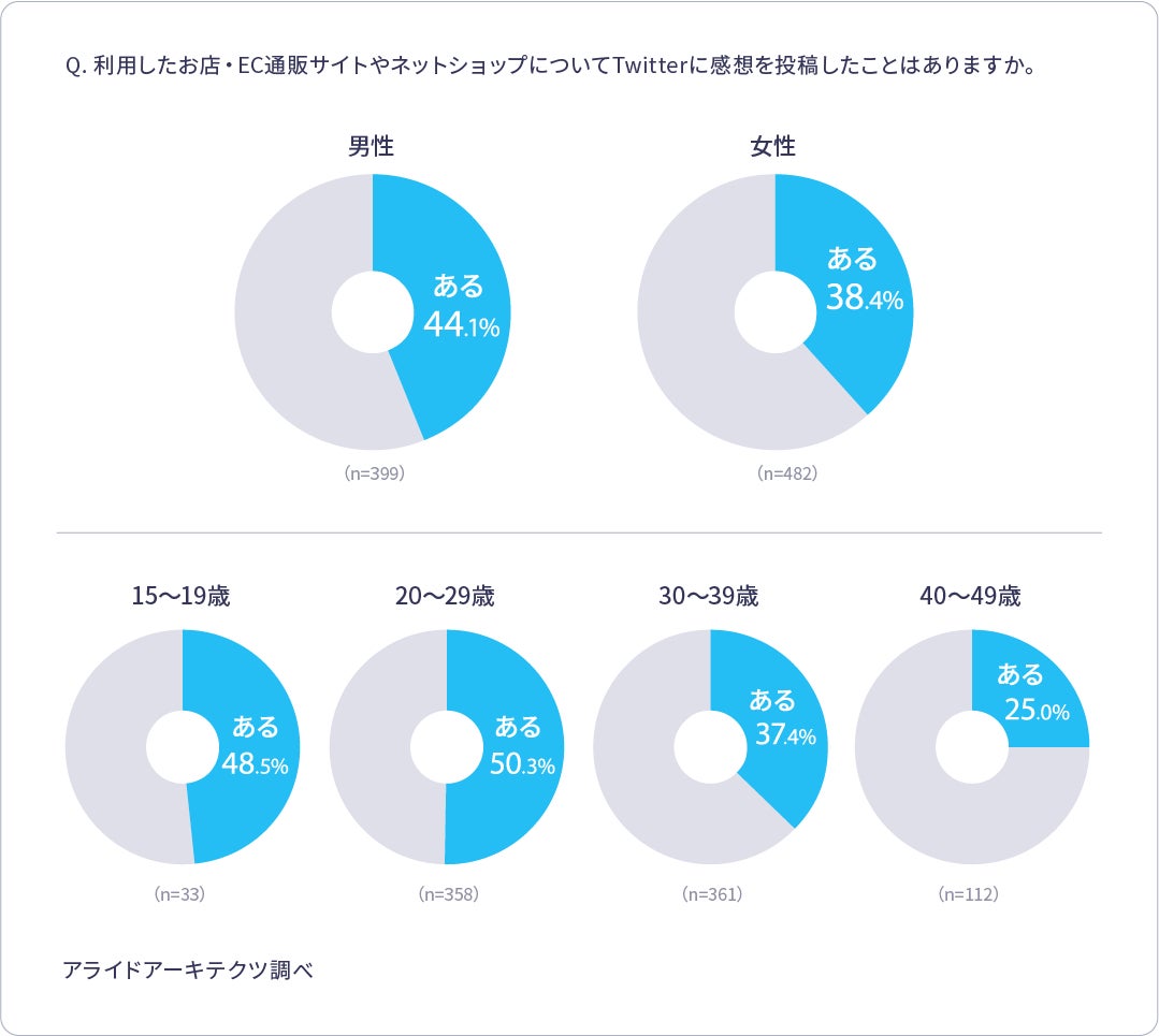 さらに、「お店・EC通販サイト・ネットショップの感想の投稿経験」について聞いたところ、全体の41.0%の人が、Twitter上に何らかのお店・EC通販サイト・ネットショップの感想を投稿したことがあると回答しました。男女別では、男性の44.1%、女性の38.4%となっており、こちらも男性の方が、女性よりも6%ほど多い結果となりました。