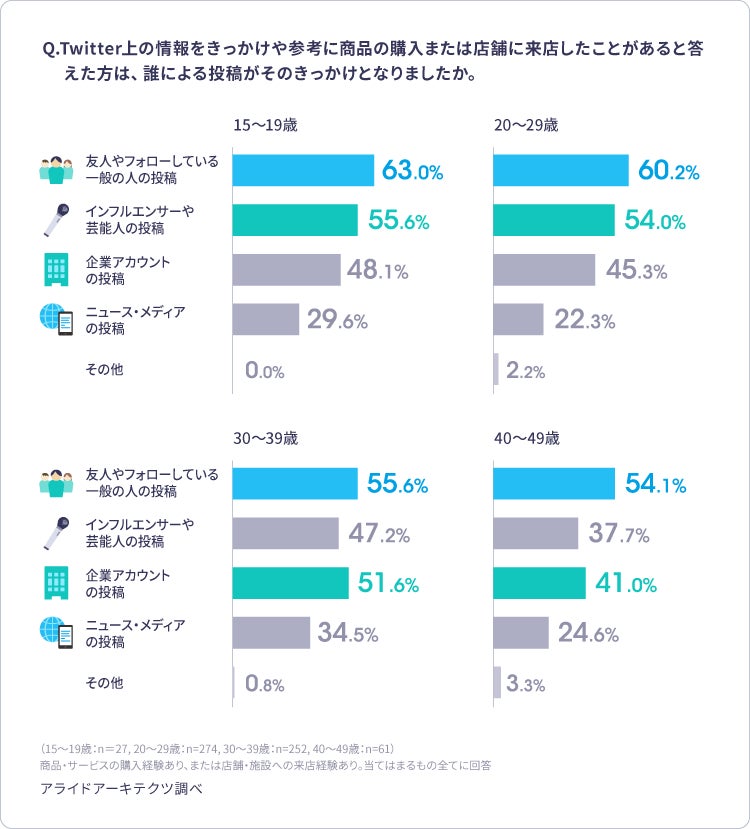 年代別に見ても、すべての世代で「一般ユーザーの投稿」がもっとも購買・来店のきっかけになっています。次いで多い回答として10代、20代は「インフルエンサーや芸能人の投稿」が挙げられた一方で、30代、40代は「企業アカウントの投稿」が挙げられており、年代によって参考にする情報が異なることが明らかになりました。