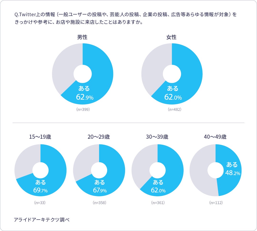 「Twitter上の情報をきっかけや参考とした来店・訪問の経験」について聞いたところ、全体の62.4%の人が、Twitter上の情報をきっかけや参考として、何らかのお店や施設への来店経験があると回答しました。