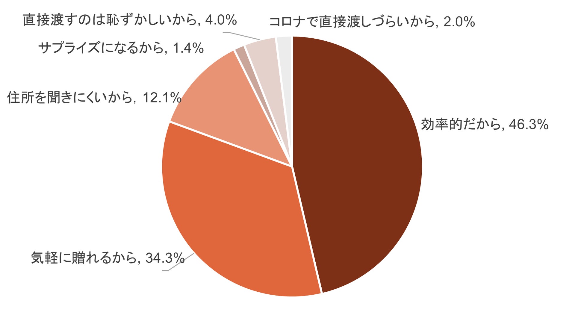 ホワイトデーにソーシャルギフト利用を検討する理由として、「効率的だから」(46.3%)と、「気軽に贈れるから」(34.3%)という回答が多く挙がりました。他にも「住所を聞きにくいから」(12.1%)、「直接渡すのは恥ずかしいから」(4.0%)、「コロナで直接渡しづらいから」(2.0%)という回答もあり、ソーシャルギフトは贈る際のちょっとした気苦労を軽減してくれる役割も果たしているようです。