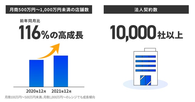 また、2021年12月の『プレミアムショッププラン』以上の各店舗における月商規模別の分布データでは、月商100万円~500万円未満の店舗数は前年同月比110%、月商500万円~1,000万円未満の店舗数は前年同月比116%と大きく成長いたしました。月商1,000万円以上のレンジにおいても増加傾向となっており、しっかりと売上を獲得している店舗が増えていることが読み取れます。