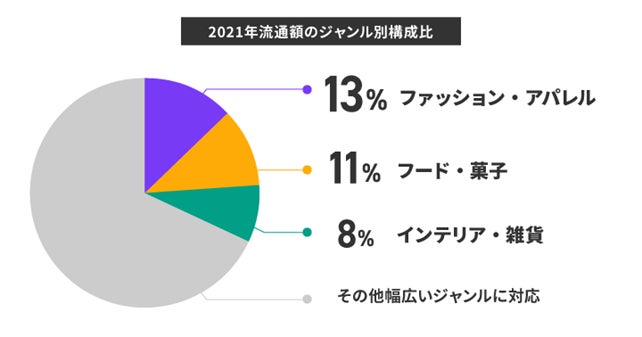 2021年の流通額をジャンル別に見ると、「ファッション・アパレル」ジャンルの流通額が最も大きく全体の13%を占めています。この傾向は、販売予告機能などアパレル店舗からの要望を取り入れた新機能の開発や、自由度の高いデザイン編集機能の提供など、「MakeShop byGMO」が以前より取り組んできた、「ファッション・アパレル」ジャンル向けの機能強化施策の成果が背景にあると考えています。