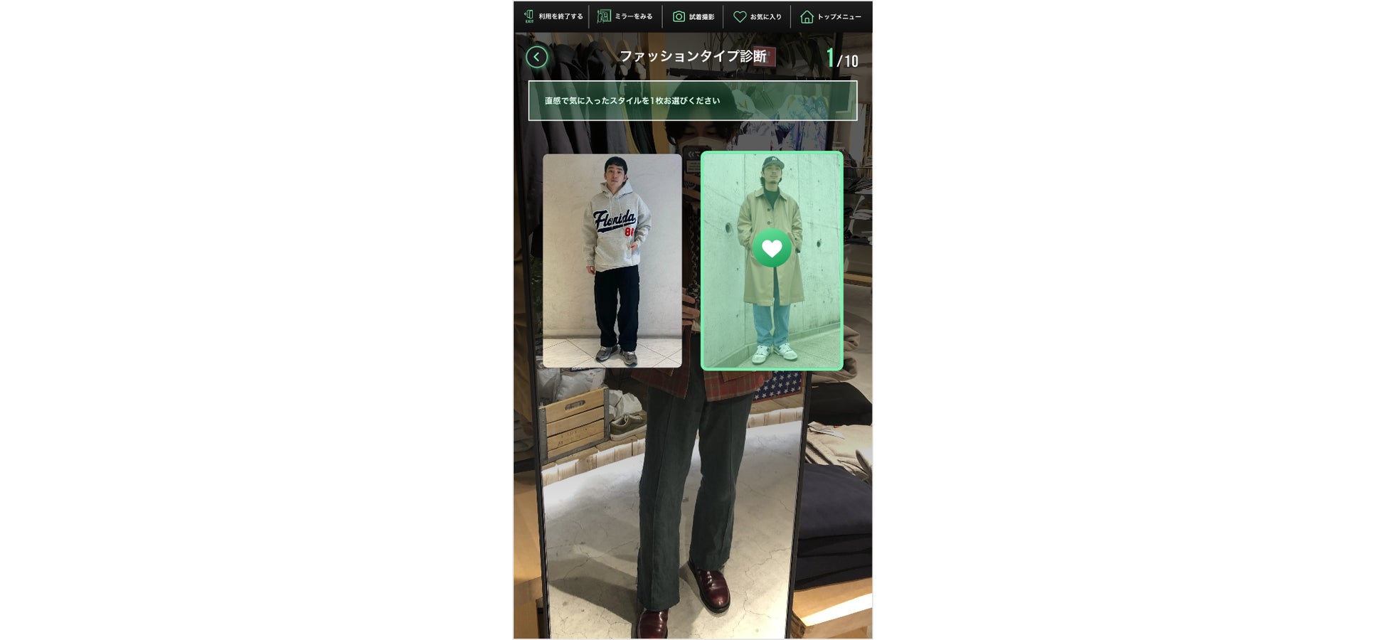 お客様の直感的な選択から潜在的な好みを識別し、おすすめのコーディネートを提案。