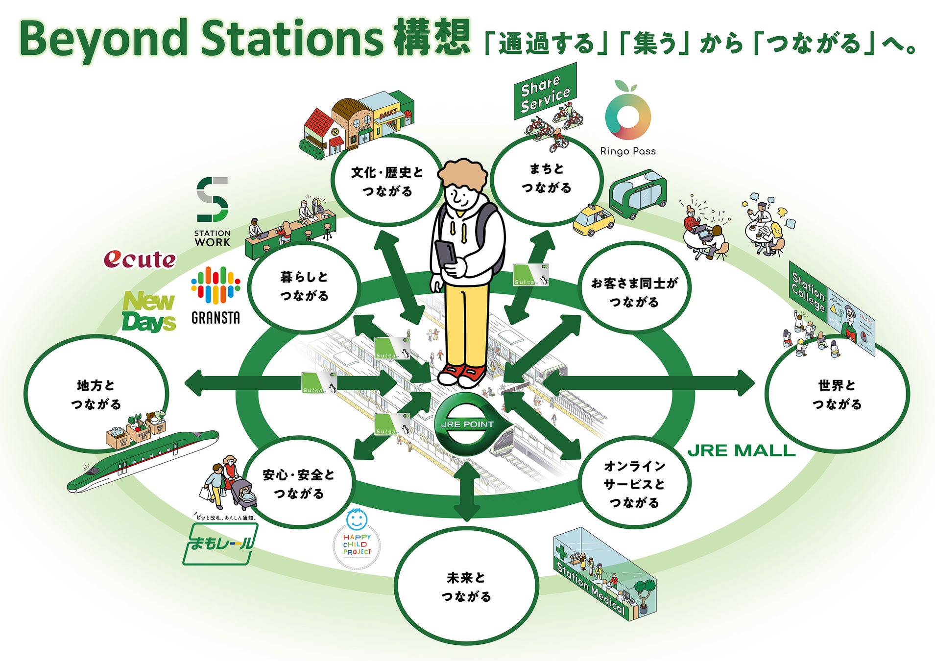 駅を「交通の拠点」から「暮らしのプラットフォーム」へと転換します。ヒトの生活における「豊かさ」を起点として駅空間の配置と機能を変革するとともに、JRE POINT生活圏の拡充を通じ、お客さまや沿線のみなさまのくらしとつながっていきます。お客さまと、暮らしを支えるサービス、地域・地方、デジタル、安全安心をつなぎ、さらにお客さま同士のつながりを創発することで、お客さま一人ひとりの可能性を拡げ、私たちだからこそ提供できる「心豊かな生活」を実現していきます。