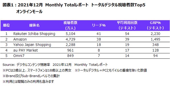 2022年1月のニールセン デジタルコンテンツ視聴率Monthly Totalレポートによると、「オークション・フリマ」ジャンルにおいて、PCとモバイルの重複を除いたトータルデジタルで最も視聴者数(2歳以上)が多かったのはMercariで2,306万人が利用しており、Yahoo Japan Auctionsが1,325万人で続いていました。また、平均利用回数でもMercariが月平均73回と最も多く、Yahoo Japan Auctionsが月平均56回で続いていました(図表1)。