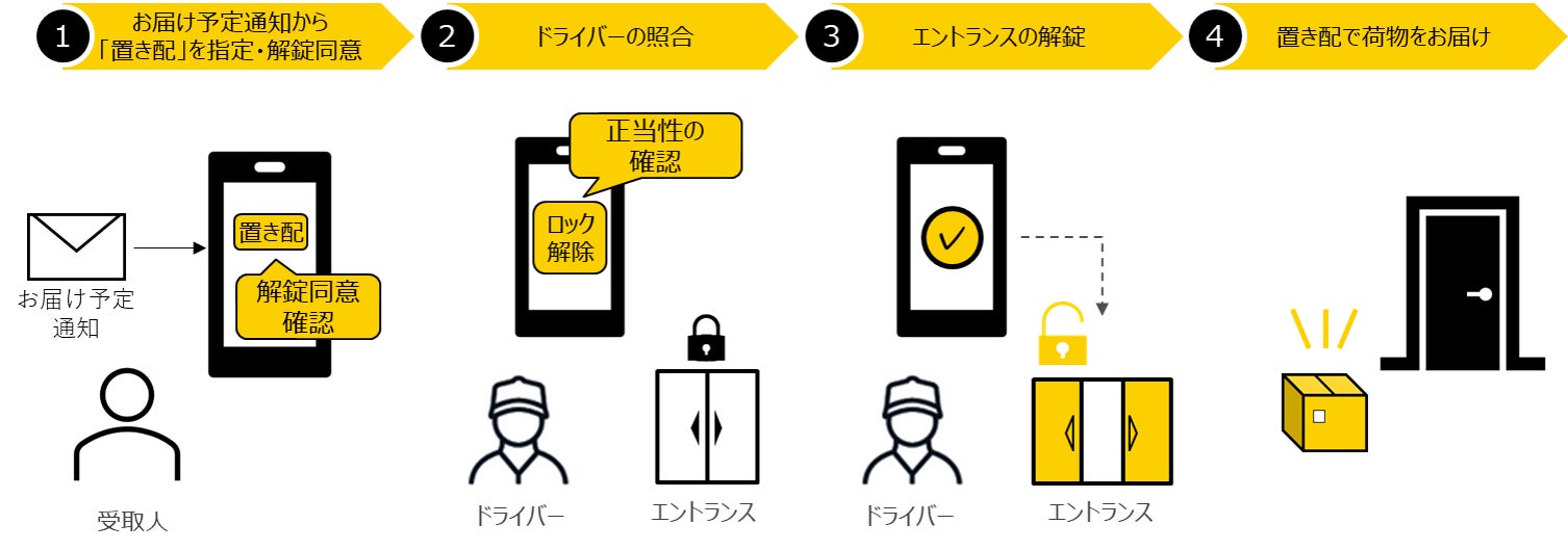 本連携により、ヤマト運輸の配達パートナー「EAZY CREW」が配達するEC専用配送商品「EAZY」を対象に、オートロック付きの集合住宅であっても、事前に受取人の承諾をいただければ自宅のドア前などに「置き配」を指定することが可能になります。開始時は、東京都練馬区と豊島区・板橋区の一部のオートロック付きマンションを対象とし、順次エリアを拡大します。また、本システムは、お客さまの解除承認を前提としたワンタイムパスワードを活用することでセキュリティを担保し、安心してご利用いたけます。 この度の「マルチデジタルキープラットフォーム」との連携は、オートロック付きマンションにおいても自宅前の「置き配」を実現するものです(※1)。本連携により、ご入居者様のご不在時でもスムーズに荷物を受け取ることが可能になります。