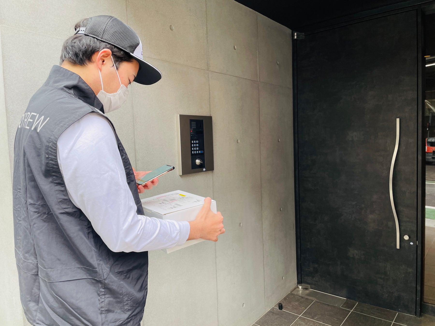 ②対象マンションに到着したEAZY CREWがオートロック解錠専用のアプリで配達荷物のバーコードをスキャンし、解錠の正当性が確認されます(「荷物ステータス」や「ドライバーの情報」など)