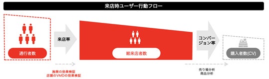 本来店舗は集客力も分析する事が重要であり、商業施設などへの出店が多い中どれだけ店頭の通行客に足を止めて頂き来店されるかを分析する事でVMDや施策の効果測定により改善が可能になります。