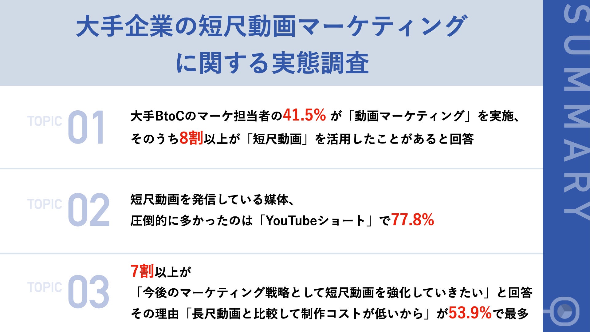 - 大手BtoC企業のマーケ担当者の7割以上が、今後「短尺動画を強化していきたい」と回答