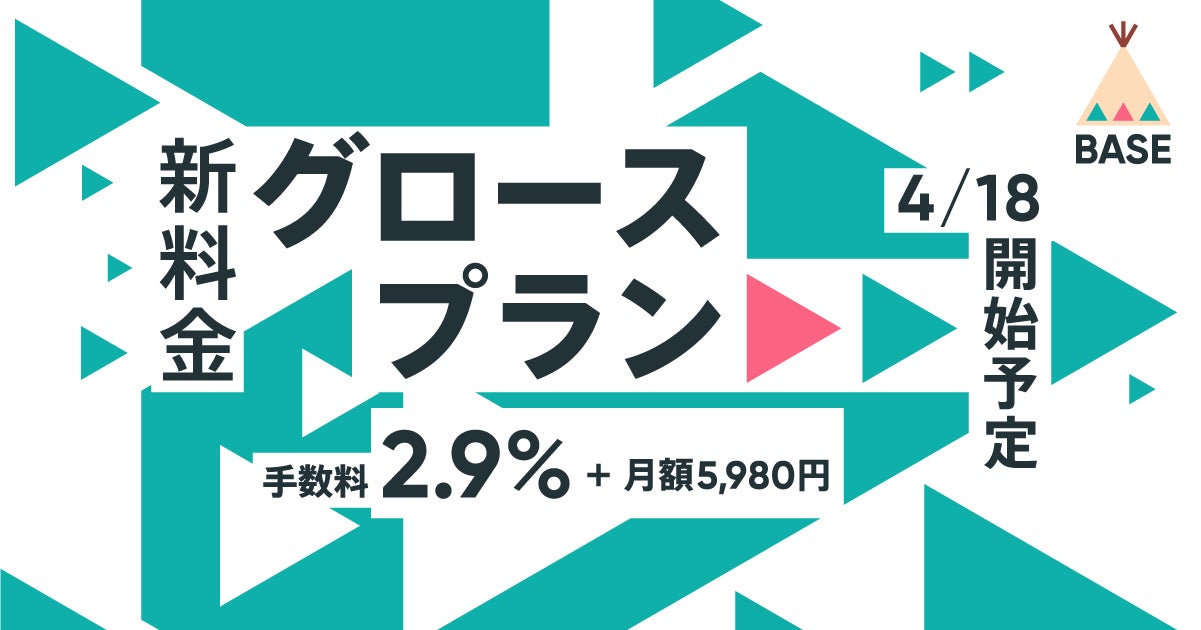 「BASE」はさらなる加盟店の成長を後押しすることを目的として、新料金体系「グロースプラン」を4月18日(月)より開始する予定です。※1 「グロースプラン」では、ご利用いただける機能はそのままに、決済手数料2.9%+月額サービス利用料5,980円(税込)で「BASE」をご利用いただけます。