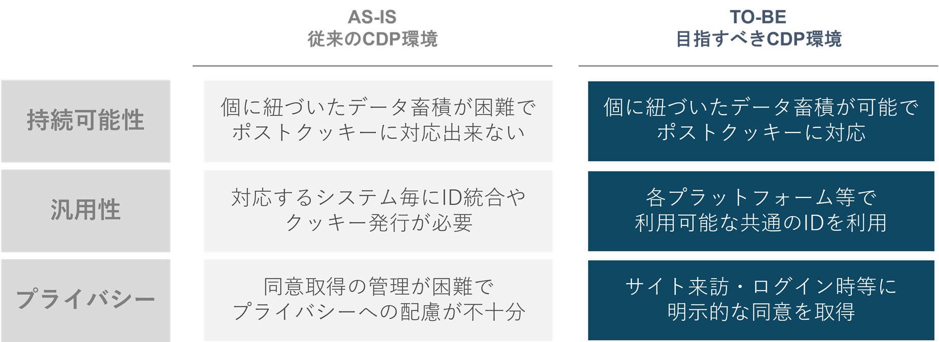 一方で、1stパーティデータの基盤としてCDPを導入する企業は増加し、クッキーによって発行されたIDをユーザーキーとして採用する企業も増えています。しかしクッキーは連携できるマーケティングツールが限定的であるため、マーケティング活動への活用がうまくいかないケースが多く見受けられます。こうしたことからも、ユーザーからの適切な同意取得と、クッキーに依存しないIDをユーザーキーとしたCDP環境は、持続可能なデータ環境の構築と効果的なマーケティング活動を目指すために、ますます重要となります。