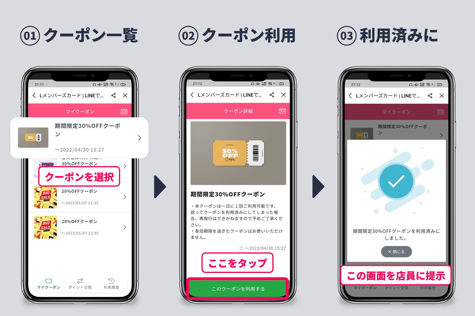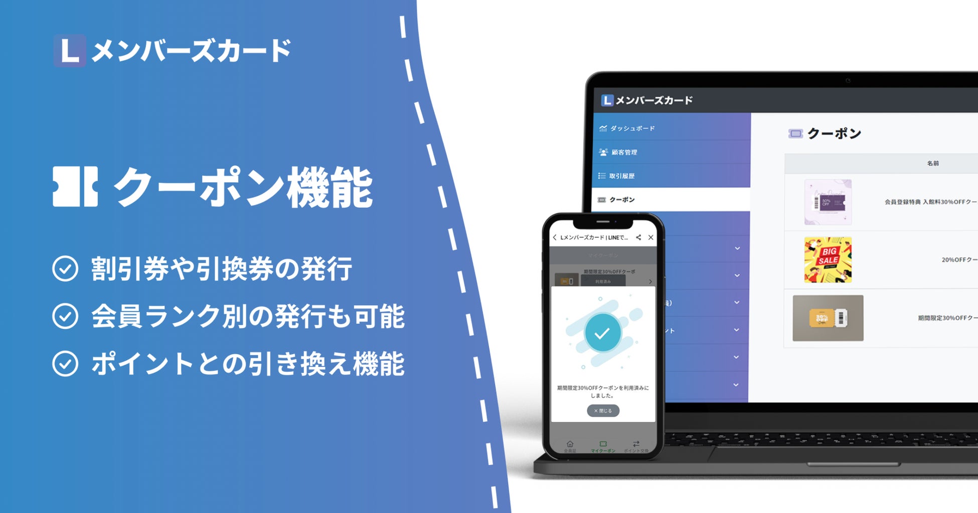 Lメンバーズカードの基本機能として利用いただけるクーポン機能では、店舗や企業が発行する割引券や引換券を、お客様がLINEミニアプリ上で簡単に確認・利用することができます。管理画面上で簡単にクーポンを発行できるだけでなく、会員ランク別にクーポンを発行する機能・貯まったポイントとクーポンを引き換える機能もございます。