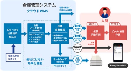 さらに、倉庫管理システムと発注管理システムを内蔵して、倉庫管理業務と発注管理業務も自動的にコントロールすることを可能としました。OMS(受注管理)⇔WMS(倉庫管理)プロセスでは、完全な自動化を実現。受注処理ロボットが自動的に受注処理を行い、倉庫管理システムでは、新規開発したオートシップ機能により、納品書や送り状を指定時間に自動印刷します。倉庫側は、朝 出社前に帳票類の印刷が完了しているので、ハンディターミナルでのトータルピッキング作業を速やかに開始できます。