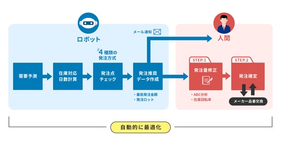 もう一つの業界初となるイノベーションが、自動発注システム(Order Robo)です。これまで、正しい需要予測に基づき最適な在庫管理を行っているEC運営会社は、ほとんどありませんでした。不適切な在庫管理は欠品や在庫過多を招き、これもまた、EC事業の収益拡大を阻害する要因となっていました。自動発注システムは、WMSのデータを日次で分析。商品ごとに需要予測を立て、リードタイムとの比較で自動的に発注推奨データを作成します。発注を確定すると、WMSに入荷予定が自動的に登録される仕組みです。