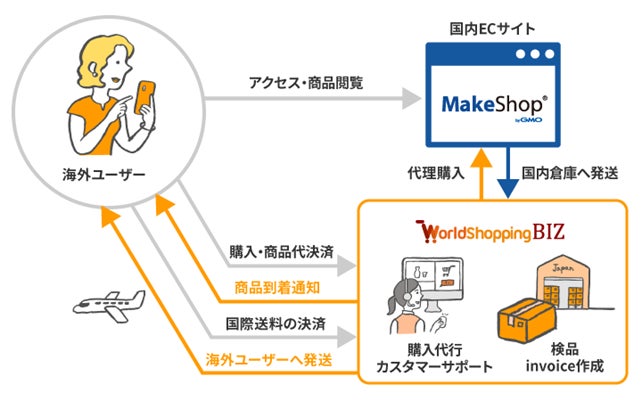 これにより、「MakeShop byGMO」をご利用のEC事業者は、「MakeShop byGMO」の管理画面から申し込むだけで、簡単に越境ECを始めることができます。購入代行の仕組みをとる「WorldShopping BIZ」を利用することで、事業者自らが海外対応する必要なく、手軽にウェブインバウンド獲得による販路の拡大を目指すことができるようになります。