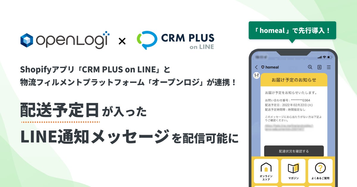 2022年4月5日、Shopify(ショッピファイ)アプリ「CRM PLUS on LINE」(株式会社ソーシャルPLUS、所在地:東京都文京区、代表取締役:岡田 風早)は、株式会社オープンロジ(東京都豊島区、代表取締役:伊藤秀嗣)が提供する物流フルフィルメントプラットフォーム「オープンロジ」と連携したことをお知らせします。