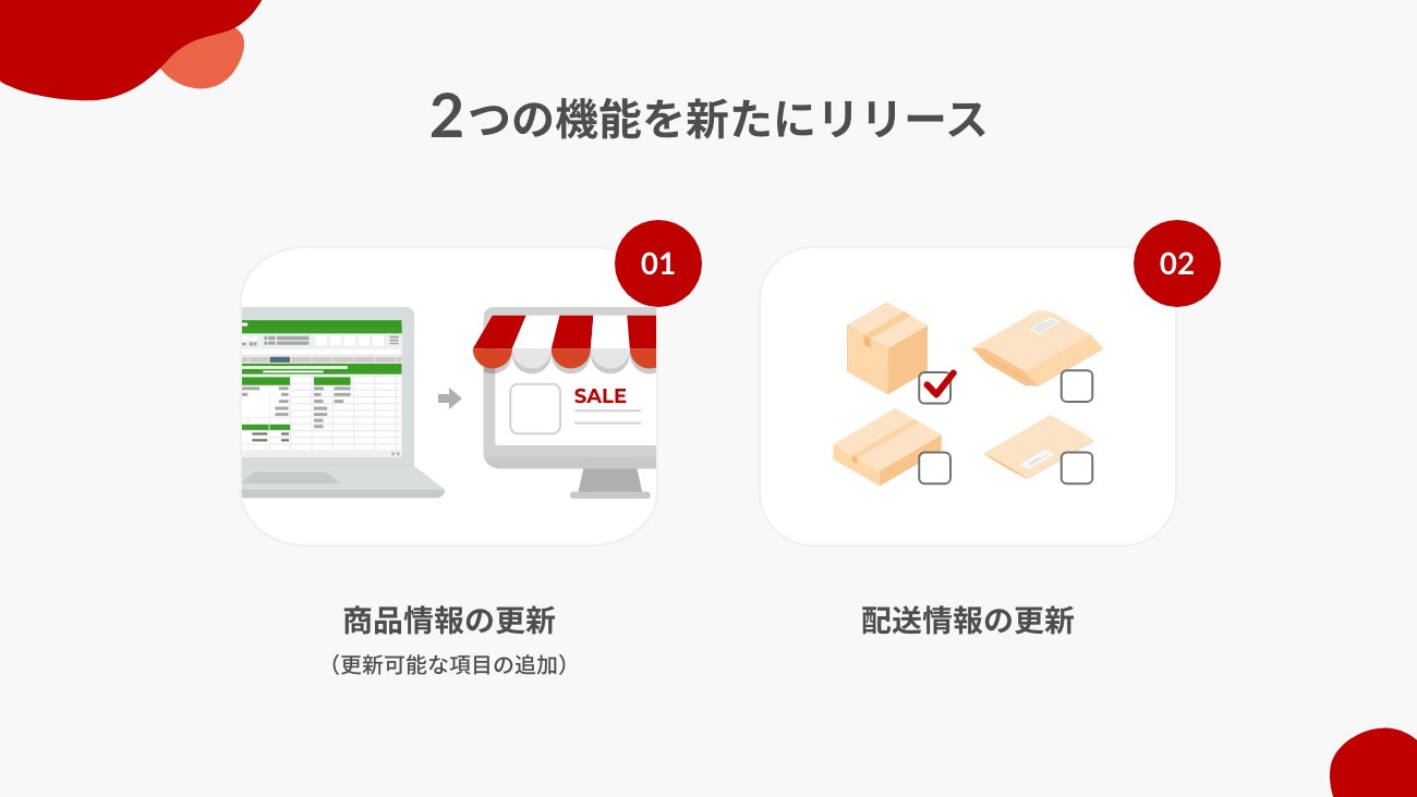 この機能を使うことで、指定日時に、商品に関する必要項目を一括更新することができ、人的負荷が軽減されます。現在、更新可能な項目は下記の通りです。