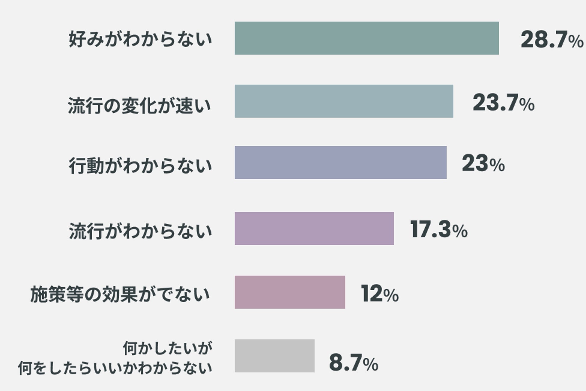 【好みがわからない】が28.7%、【流行の変化が速い】が23.7%、【行動がわからない】が23.0%、【流行がわからない】が17.3%と高い結果となりました。